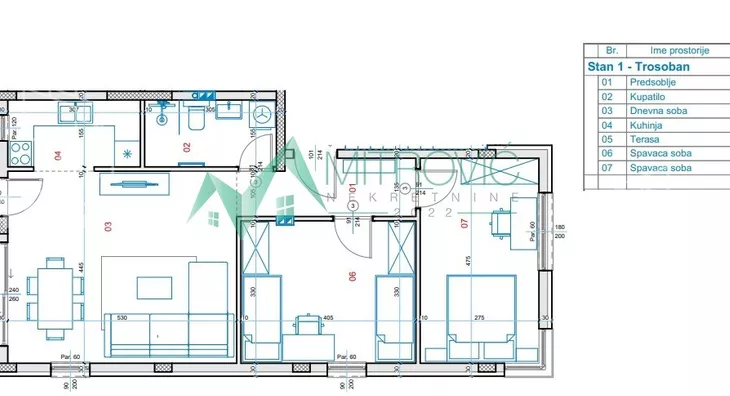 Raspored prostorija: dnevni boravak sa kuhinjom, dve spavaće sobe, kupatilo i terasa. U sve prostorije se ulazi iz hodnika.