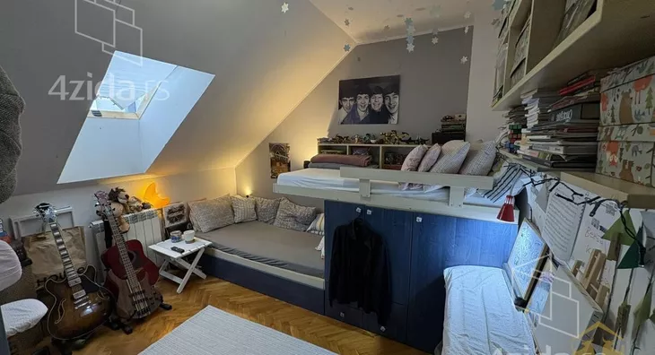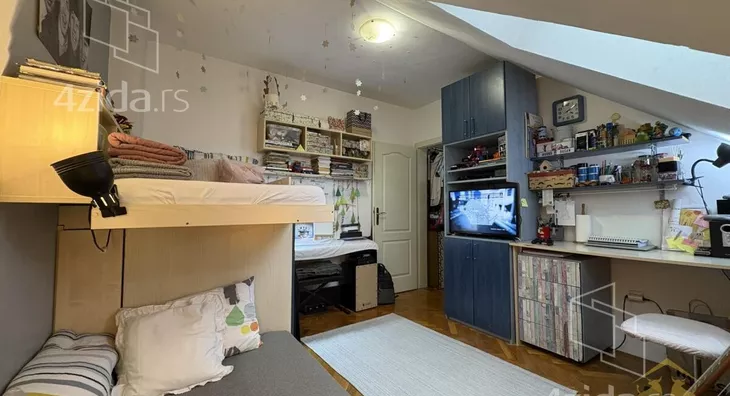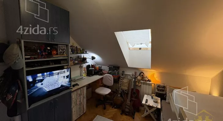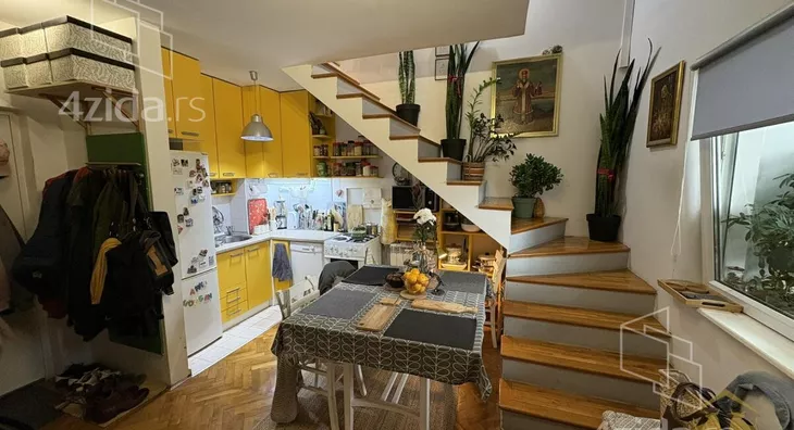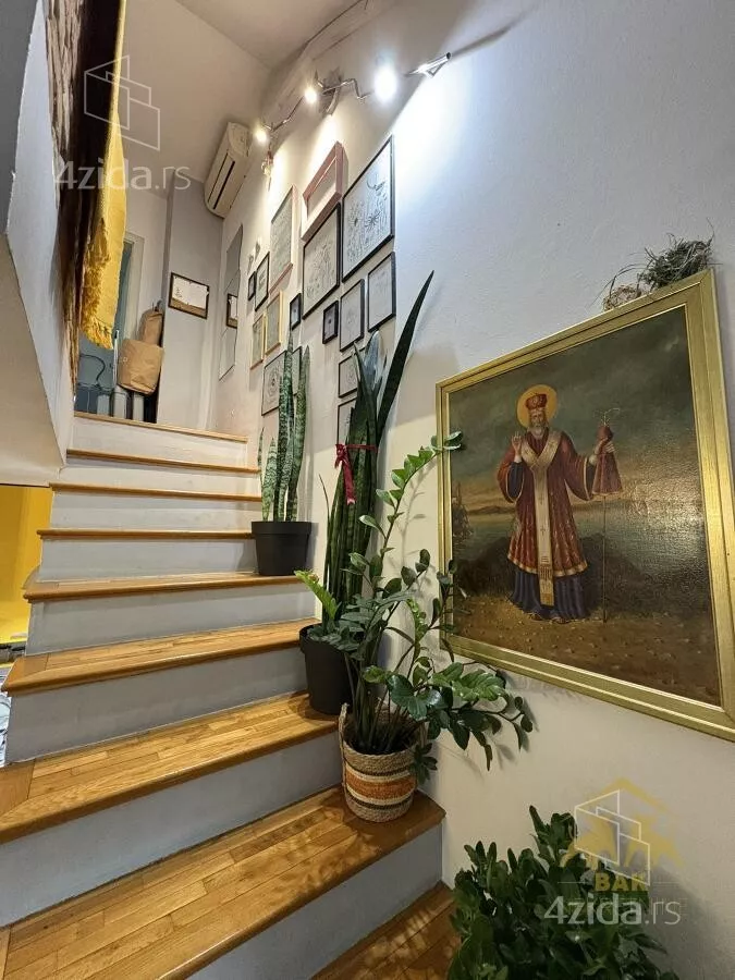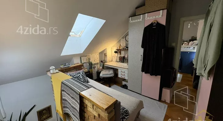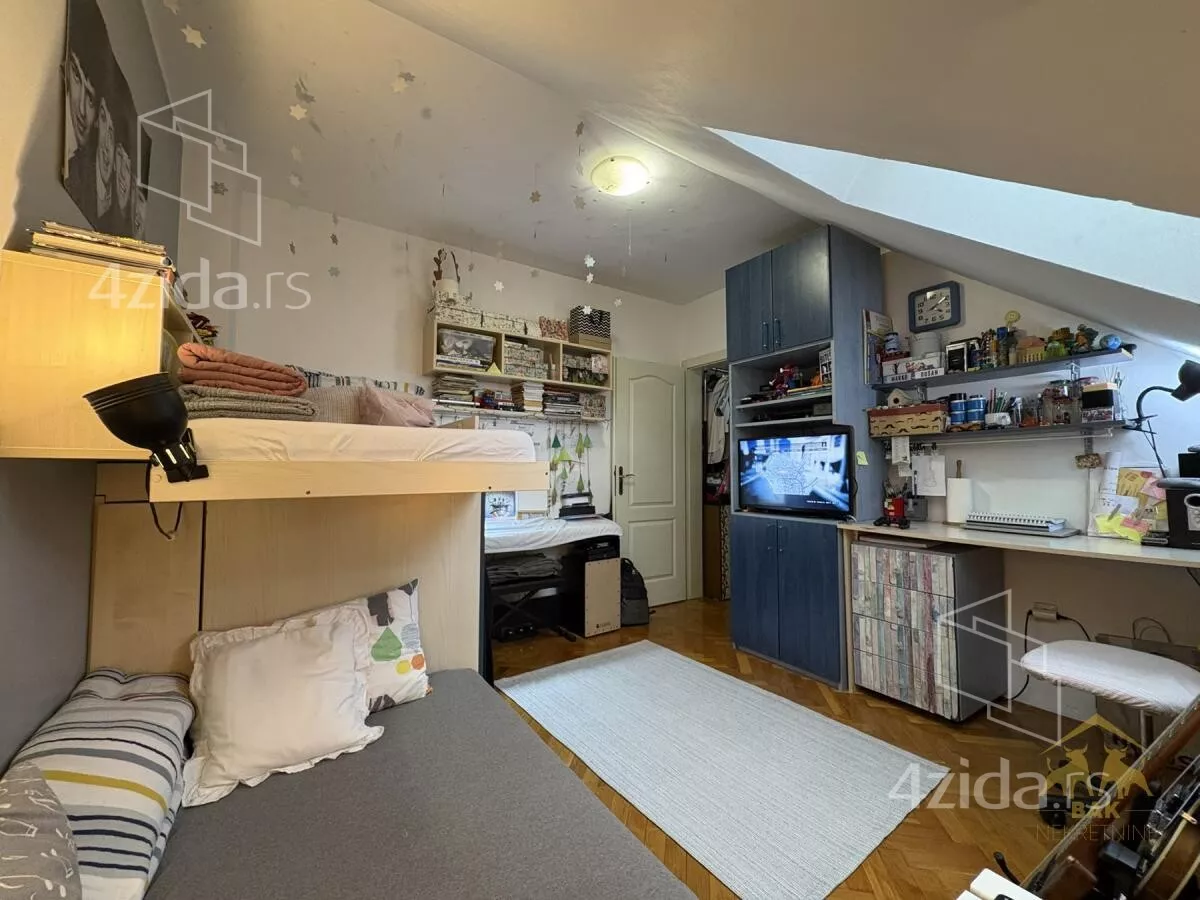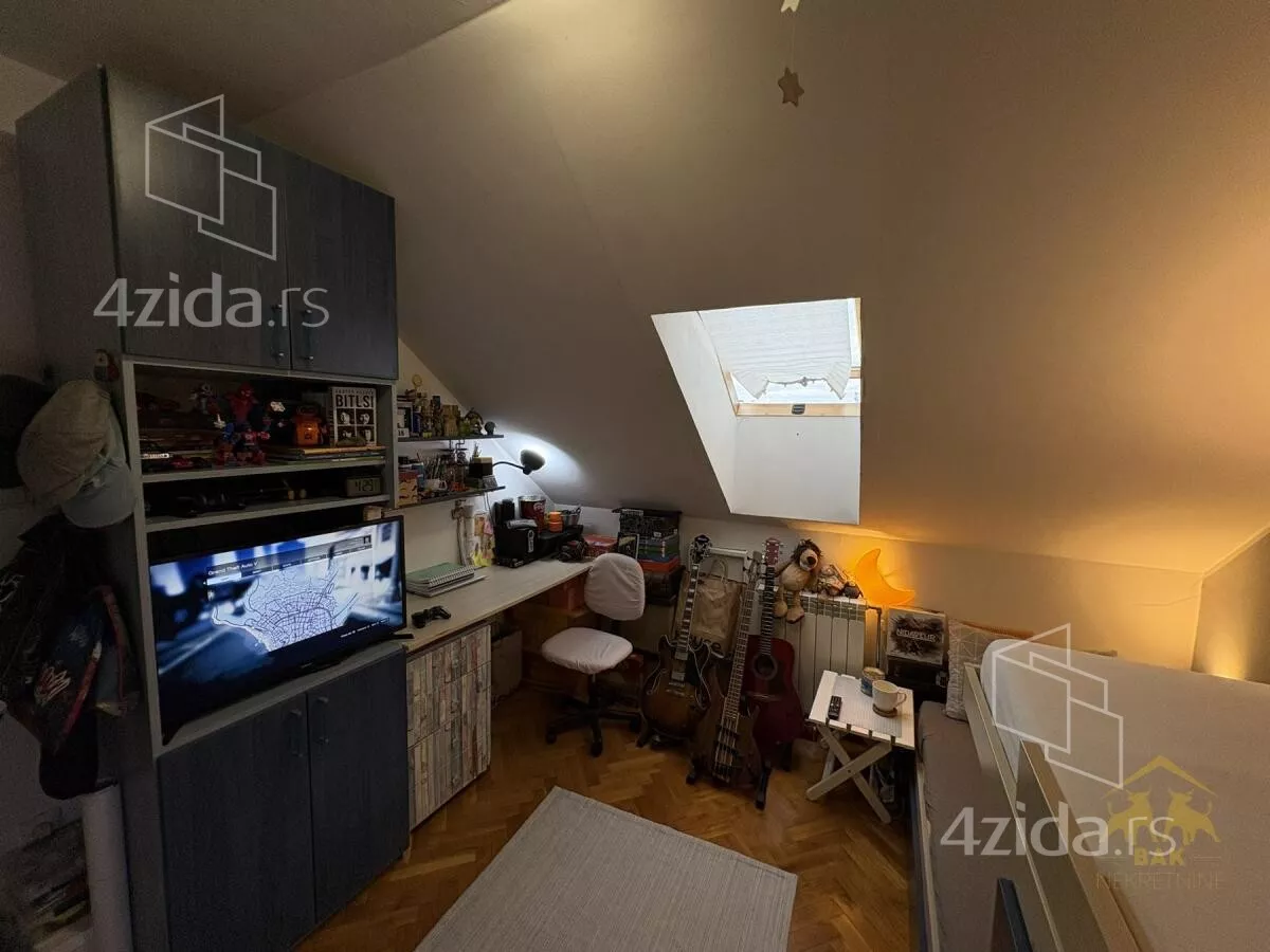 Gornja etaža obuhvata prostrano kupatilo sa kadom, jednu manju, ali funkcionalnu radnu sobu, kao i jednu standardnu spavaću sobu. Etaže su povezane unutrašnjim stepeništem sa drvenim gazistima. Kuhinja i dečija soba su uračunati u cenu stana kao i svi plakari i police koji su rađeni po meri.