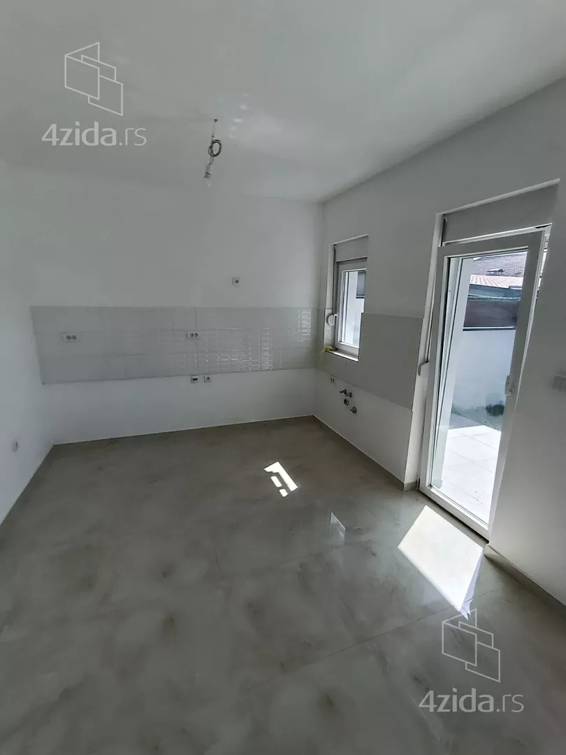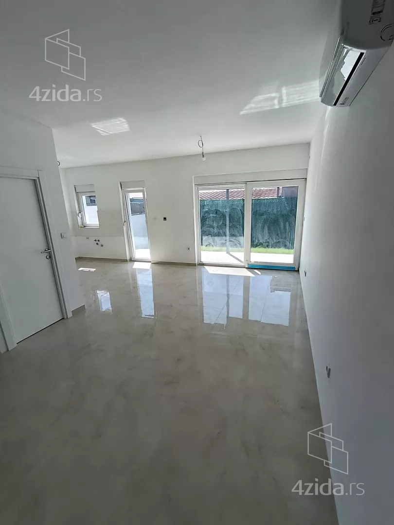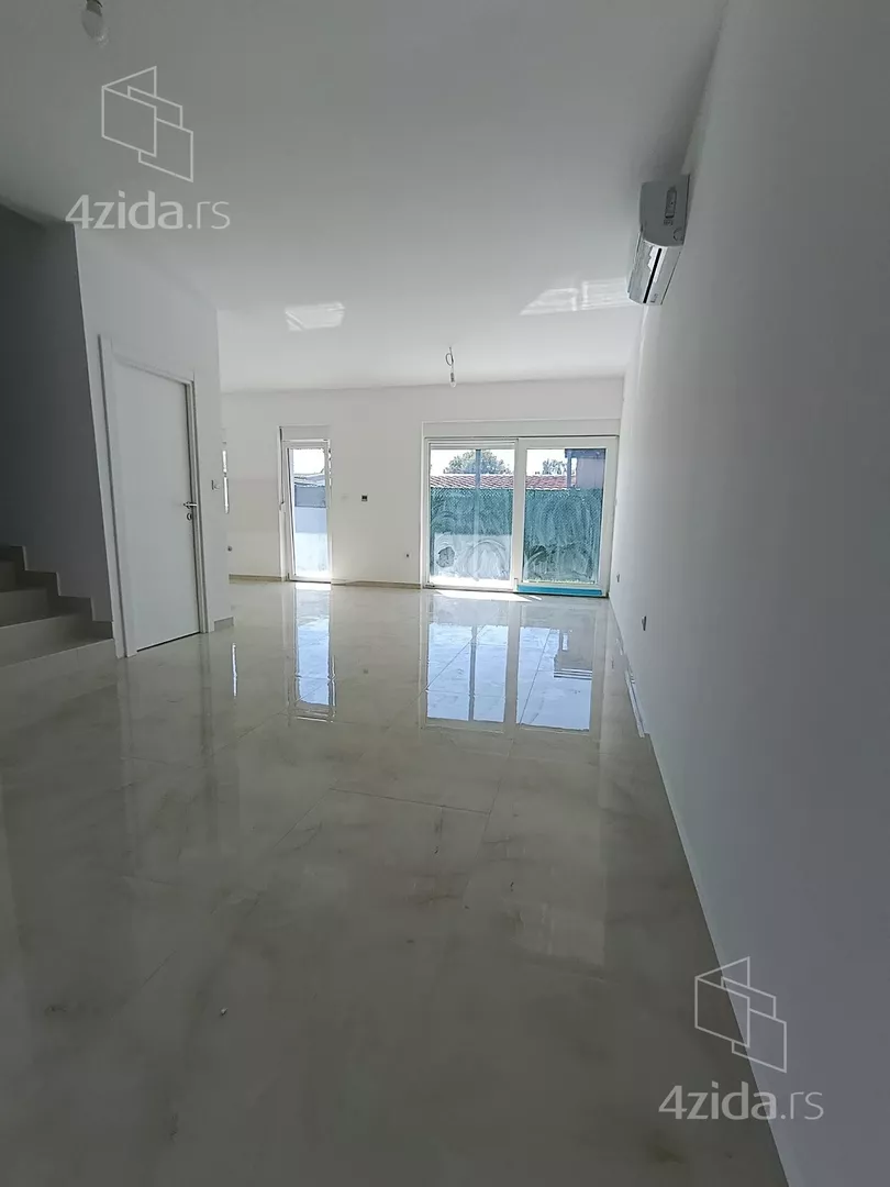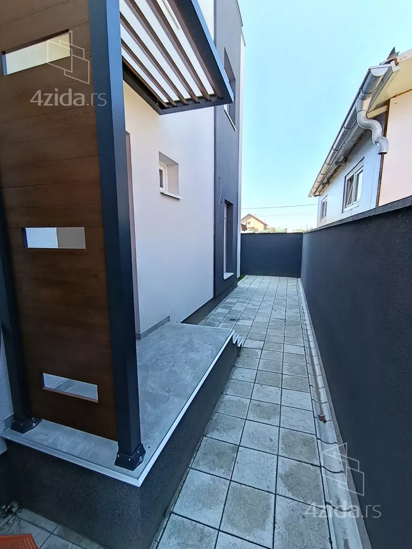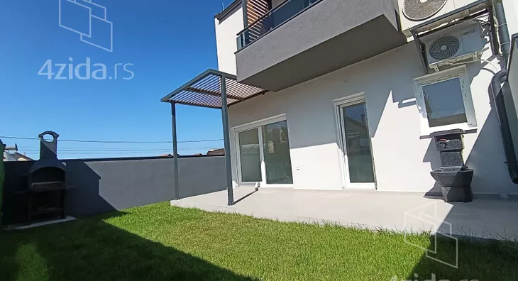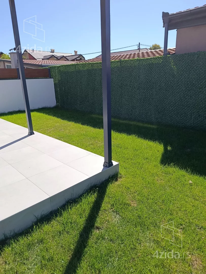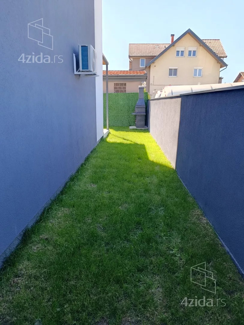 U prirodi se radi o komfornom četvorosobnom stanu od 98 m2 sa sopstvenim dvorištem od oko 90 m2, prostorom ispred stana za ulaz i bicikle,l kao i dva parking mesta za svaki stan (kuću).