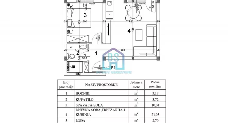 ▪️ Sastoji se od ulaznog hodnika sa mestom za plakar i cipelarnik, dnevnog boravka sa izlazom na terasu i kuhinje sa prozorom kao prirodnom ventilacijom, spavaće sobe i kupatila.