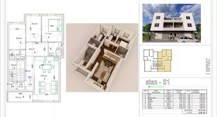 - Struktura: tri spavaće sobe, kupatilo sa walk-in tuš kabinom i dodatni toalet, komforna dnevna soba sa trpezarijom i kuhinjom sa prirodnom ventilacijom