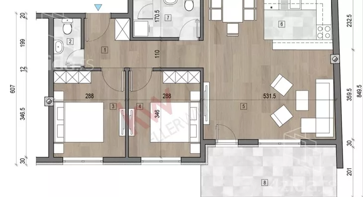 Prostorije: velika dnevna soba sa kuhinjom i trpezarije po principu Open-space-a, dve spavaće sobe, predsoblje, centralno kupatilo, toalet i prostrana terasa. Stan je veoma svetao i topao(južno orijentisan), funkcionalan, sa komfornim sobama pravilnog oblika. U sve prostorije se ulazi iz predsoblja, nema prolaznih soba čime je obezbeđena privatnost.