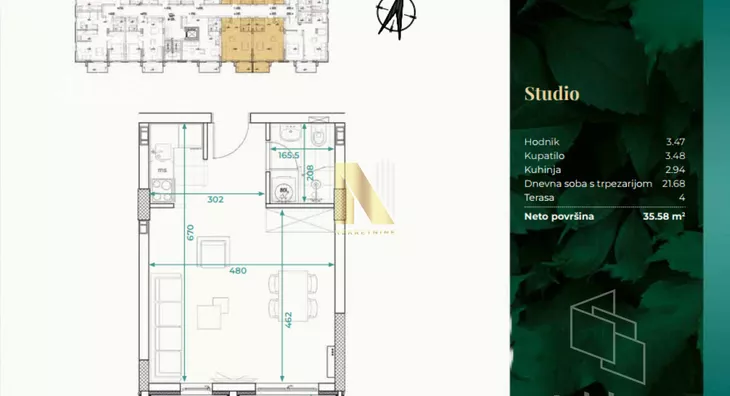 Ovaj stan se nalazi na trećem spratu od ukupno četiri i odlikuje ga odličan raspored prostorija. Sastoji se od dnevnog boravka sa kuhinjom i trpezarijom, ulaznog hodnika, kupatila i terase. Zahvaljujući strukturi, predstavlja i odličnu priliku kako za život, tako i za kratkoročno izdavanje.